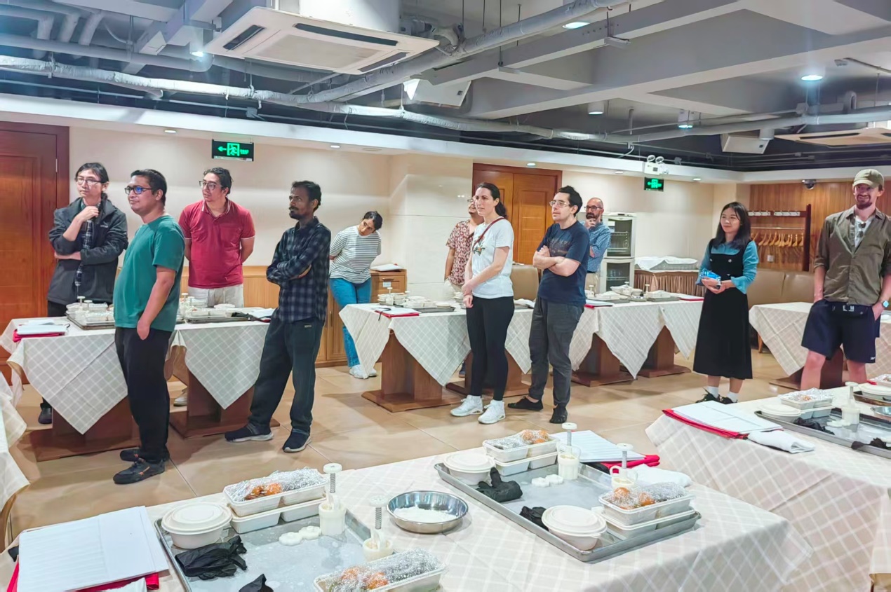 随后,外专们四人一组学习制作桃山皮月饼。大家围站在操作台前,将混合了蝶豆花粉的桃山皮包裹住不同风味的馅料,并搭配丰富的印花颜色,轻轻按压后,印有‘玉兔’‘桂花’图案的月饼便成型,不少专家举着自己制作的‘专属月饼’拍照留念,现场笑声不断。在猜月饼品类环节,外专们品尝并猜鉴了多种风味的月饼,从经典五仁到融合中西的法式乳酪,在美味中深入感知中华饮食文化的包容与创新。